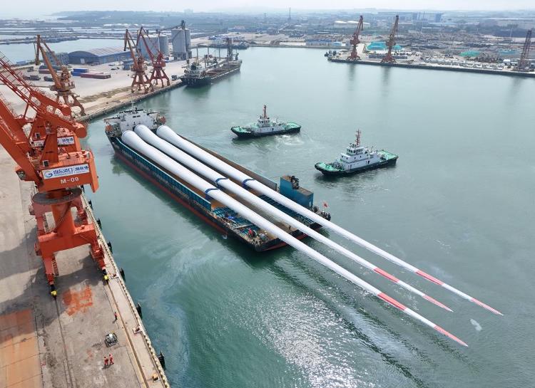 2025年8月1日,超大尺寸海上風電葉片從山東港口煙臺港蓬萊港區起運(無人機照片)。新華社發(唐克攝)